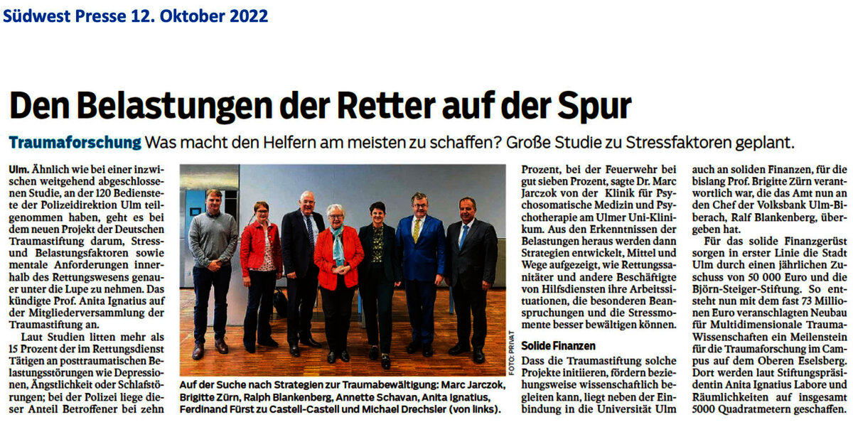 Ulm. Ähnlich wie bei einer inzwischen weitgehend abgeschlossenen Studie, an der 120 Bedienstete der Polizeidirektion Ulm teilgenommen haben, geht es bei dem neuen Projekt der Deutschen Traumastiftung darum, Stress- und Belastungsfaktoren sowie mentale Anforderungen innerhalb des Rettungswesens genauer unter die Lupe zu nehmen. Das kündigte Prof. Anita Ignatius auf der Mitgliederversammlung der Traumastiftung an.